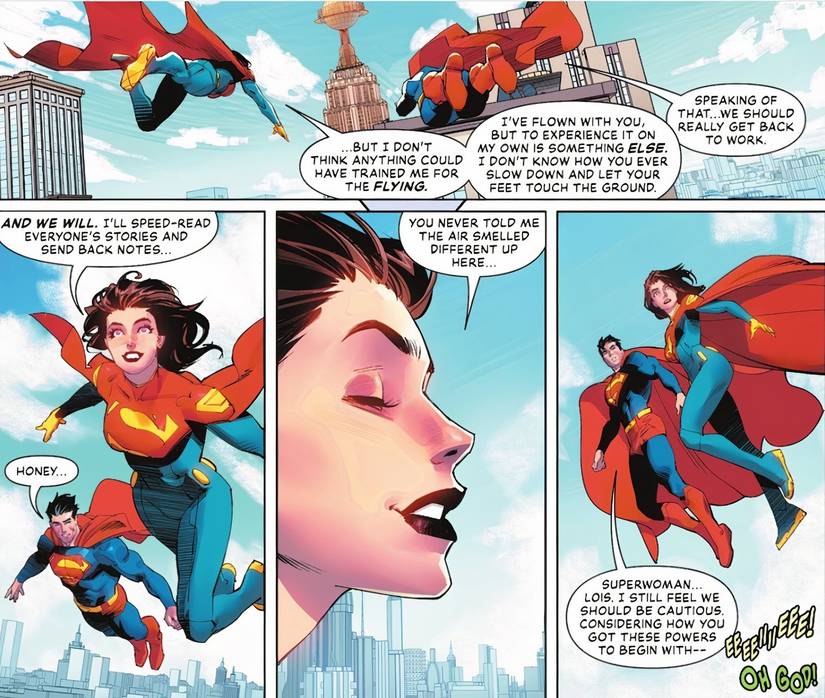 Mientras Lois menciona sus otros poderes recién descubiertos, como sus súper sentidos,habla de volar con una admiración y un amor distintivos, dejando en claro que esta es su habilidad favorita en su nuevo conjunto de poderes. Este poder también recibe una atención significativa a lo largo del número, ya que se muestra a Lois y Clark volando juntos en varias escenas, incluso participando en una carrera aérea. El asombro de Lois por volar, combinado con el énfasis narrativo en esta habilidad, sugiere que Superwoman, y tal vez incluso Joshua Williamson, cree que volar es el mejor poder kryptoniano.