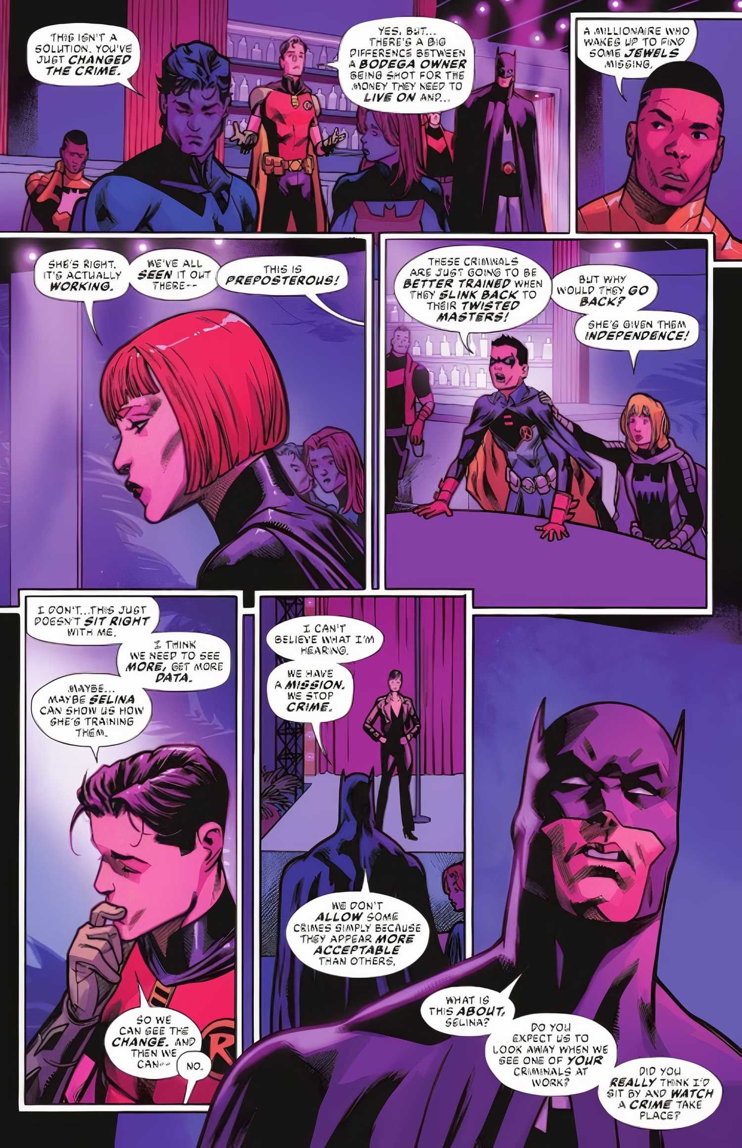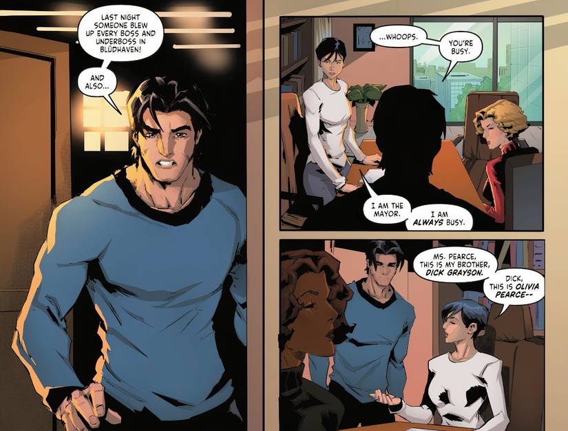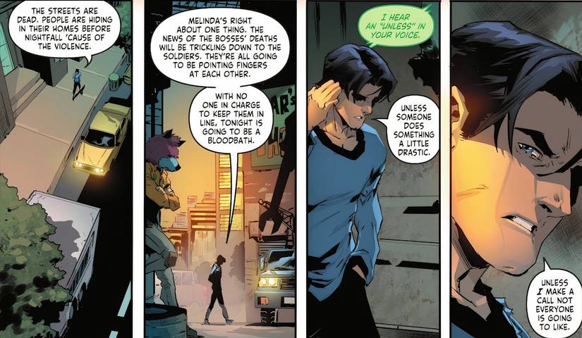 Básicamente, este acuerdo armará al corrupto departamento de policía de Bludhaven con armas de grado militar, intensificando aún más la ya creciente violencia de las pandillas y poniendo a Nightwing en un peligro aún mayor, ya que esas armas probablemente también le apuntarán a él. A pesar de su desacuerdo con la decisión de su hermana de convertir a la policía en un arma, Dick reconoce que, una vez desaparecidos los jefes del crimen, es sólo cuestión de tiempo antes de que el conflicto entre los subordinados estalle en un baño de sangre.—a menos que haga “Una llamada que no le va a gustar a todo el mundo”. Esta llamada es la decisión de Nightwing de controlar el crimen en lugar de combatirlo, lo que indica que está tomando una página del libro de Jason Todd.