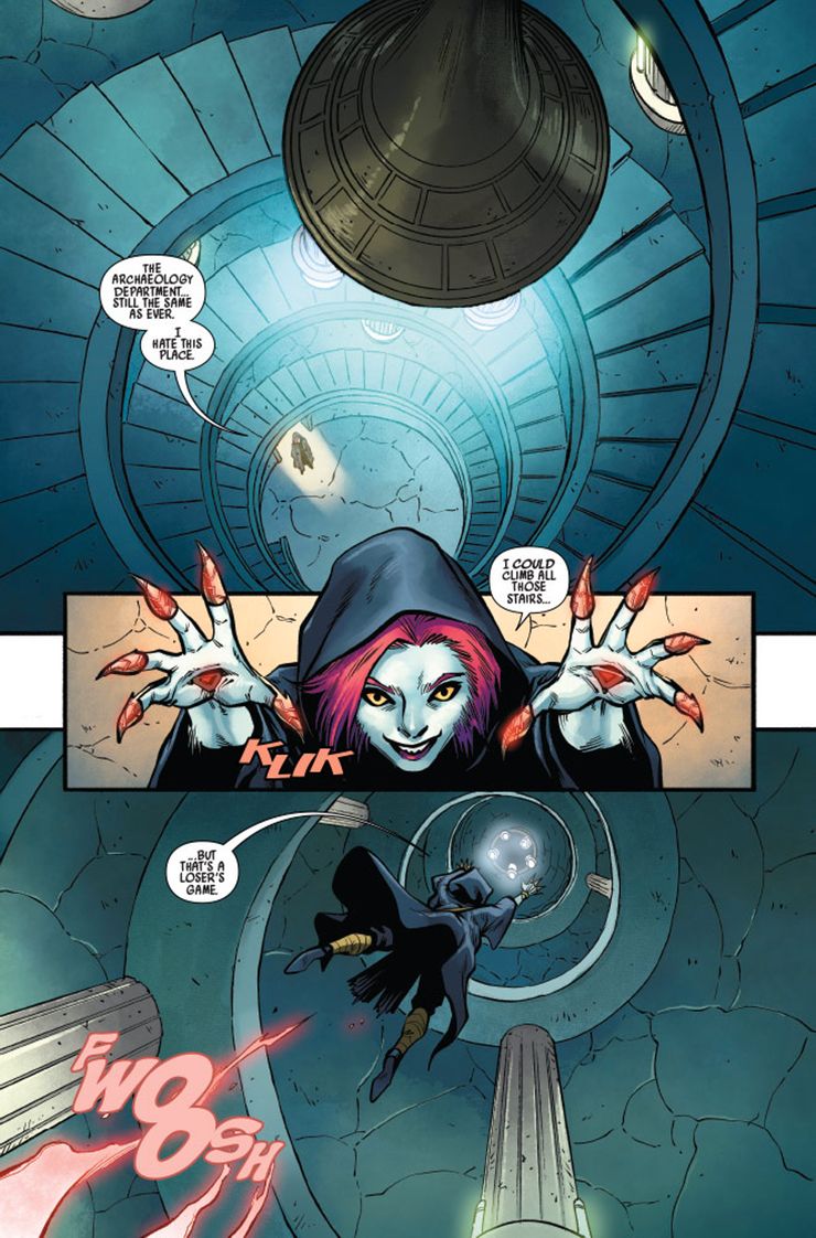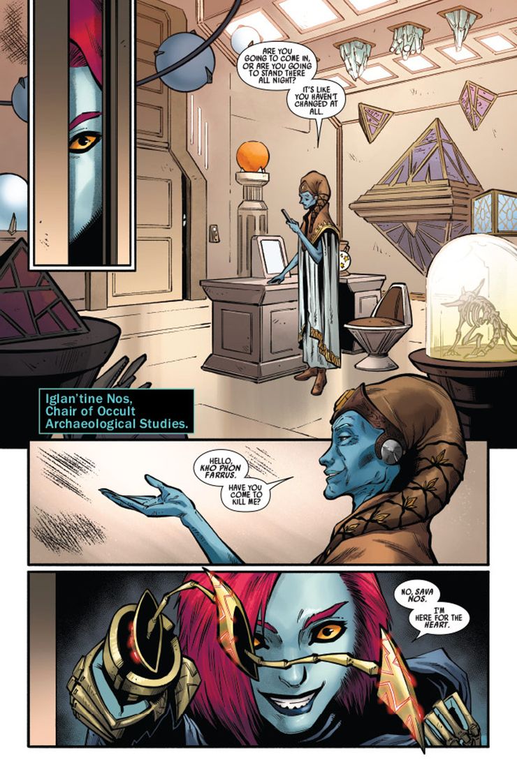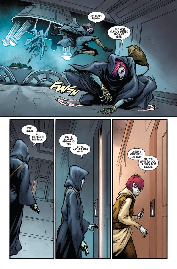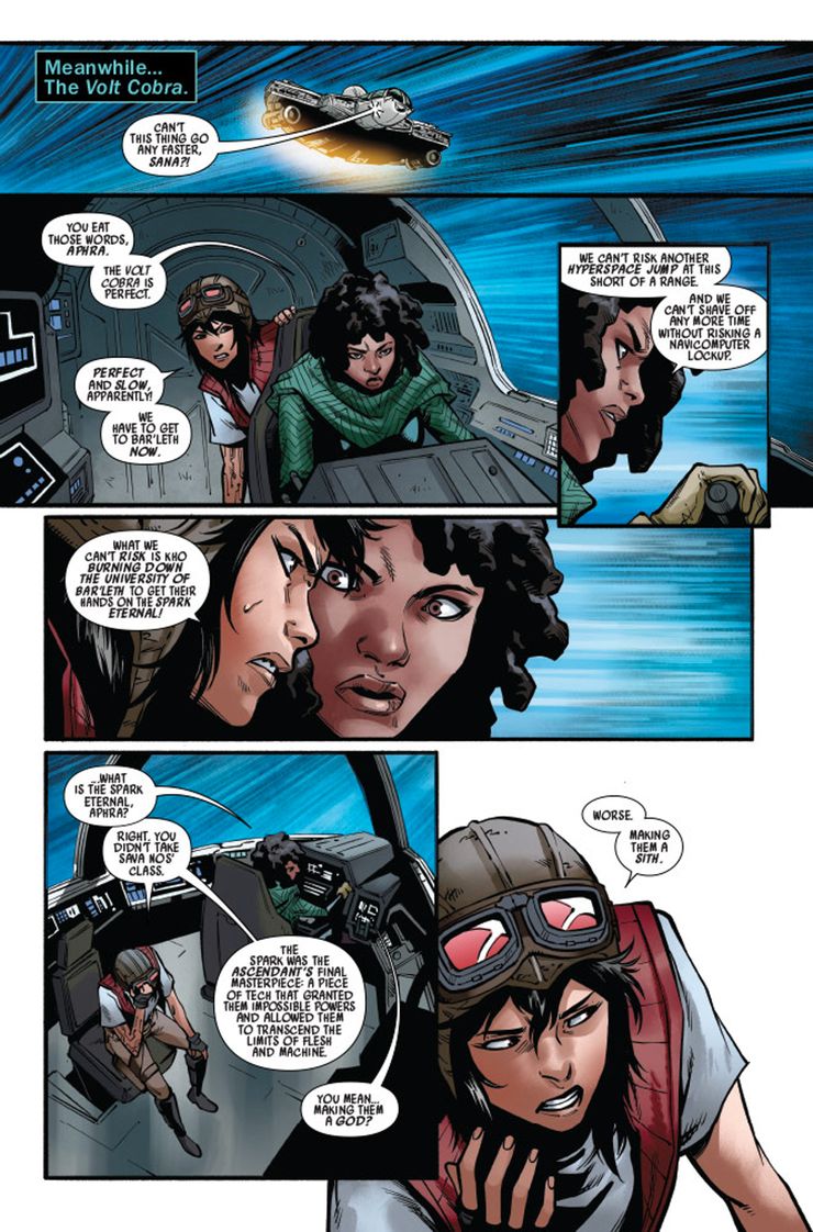 Desafortunadamente, incluso la Doctora Aphra está fuera de su alcance en este momento. Uno de sus rivales, Kho Phon Farrus, intenta usar la tecnología para imitar a la Fuerza, decidido a convertirse en un Lord Sith. Descubrieron la tecnología de un culto del lado oscuro llamado Ascendant, que buscaba imitar el poder de los Sith, y Aphra se encontró en el lado equivocado de ataques inquietantemente similares a los que enfrentó cuando huía del mismísimo Darth Vader. . Peor aún, el objetivo de Kho Phon Farrus aparentemente es localizar una pieza específica de la tecnología Ascendant: la llamada “Spark Eternal”.