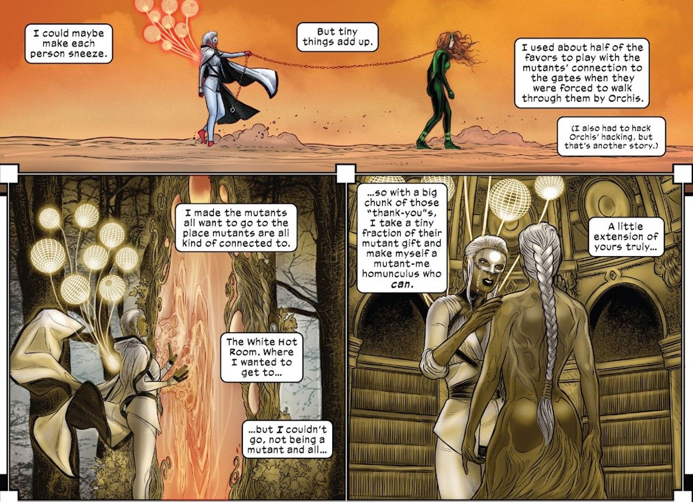 - X-Men inmortales El número 18 contiene una sugerencia innovadora de que los mutantes no son productos de la ciencia o la evolución, sino seres mágicos conectados a la Sala Blanca Caliente.