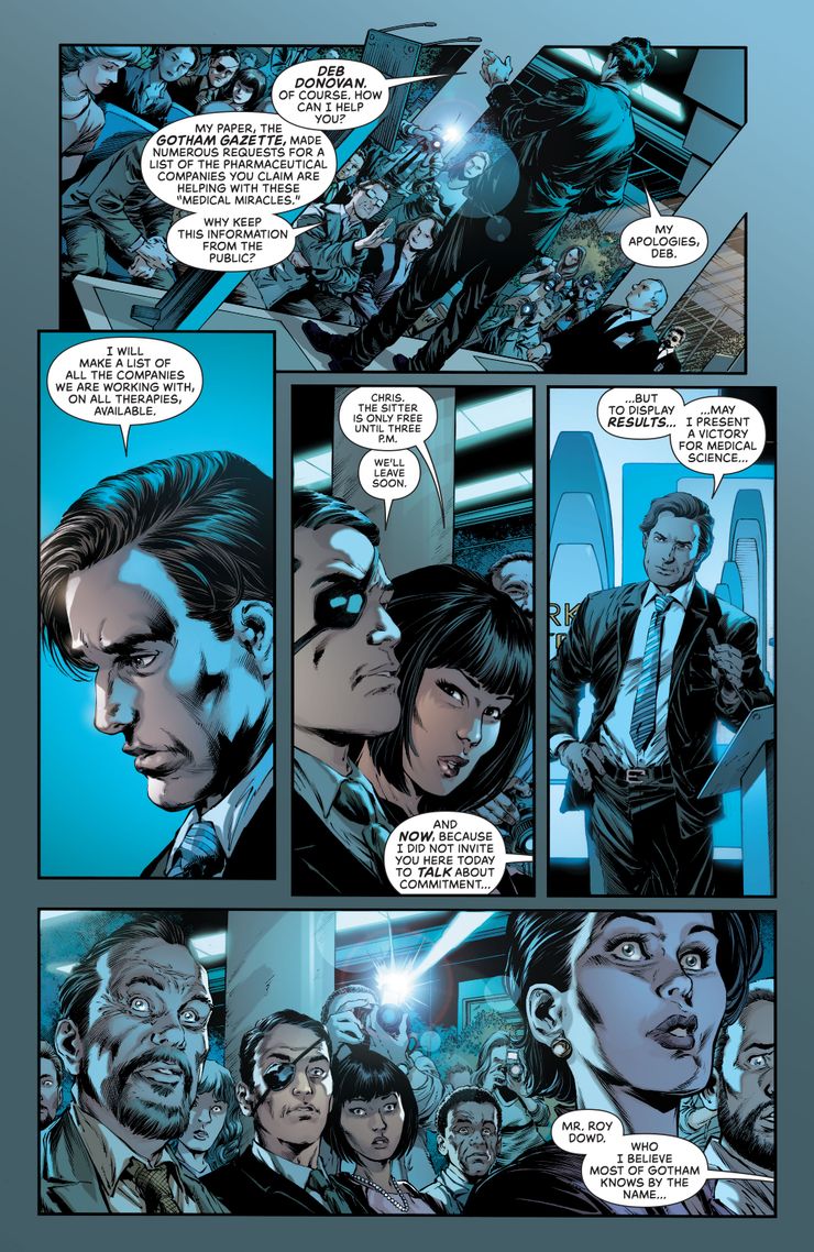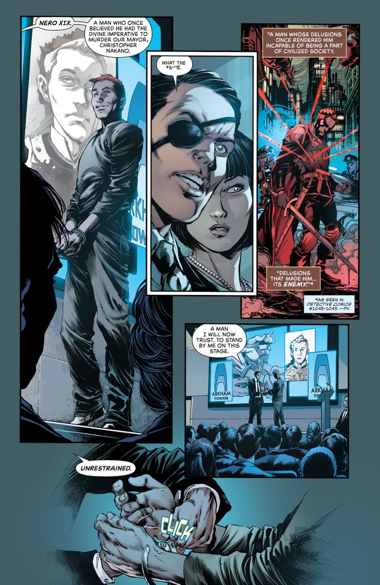 En una vista previa de Batman: Detective Comics # 1047 de Mariko Tamaki, Matthew Rosenberg, Ivan Reis, Danny Miki y Fernando Blanco, el director de Arkham Tower, Dr. Wear, da una presentación, mostrando la misión de la nueva instalación, así como el éxito que ya han tenido con sus nuevas prácticas revolucionarias. Como ejemplo, sacan al asesino conocido como Nero XIX que se veía a sí mismo como un rey con el propósito divino de matar al alcalde de Gotham. Sin embargo, parece que Nero se ha curado gracias a los esfuerzos de Arkham Tower y sus misteriosos nuevos tratamientos. Disfrute de las páginas de vista previa y la sinopsis del problema: