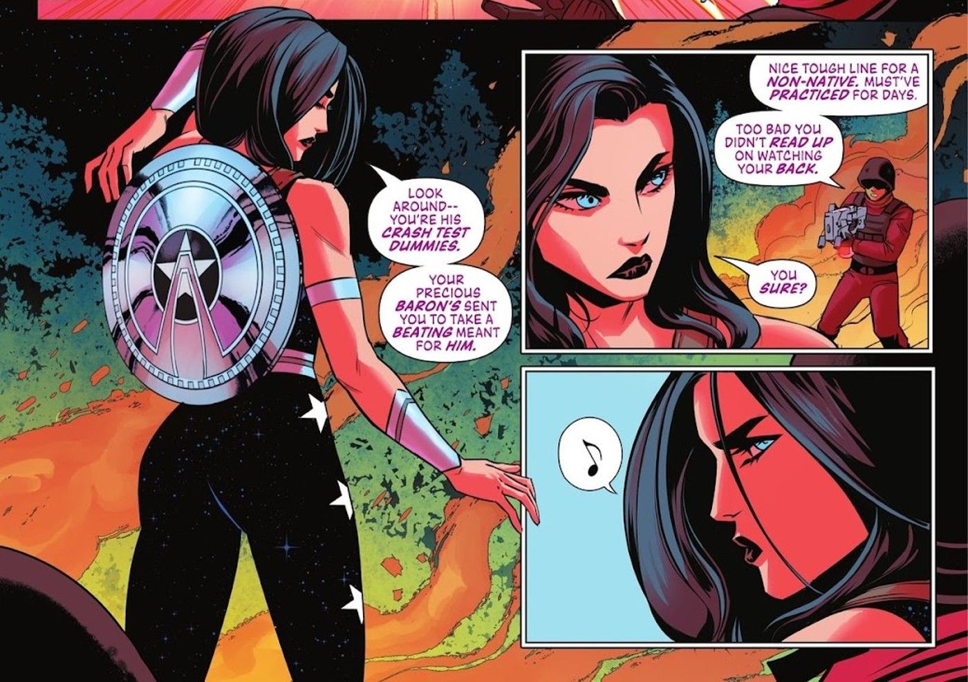 Donna Troy, a pesar de su larga trayectoria editorial y su origen siempre cambiante, rara vez se la ha asociado con una sola arma y, en cambio, tiende a confiar en su propia fuerza y poderes. Dicho esto, al igual que Wonder Woman y las otras Amazonas, se la conoce por usar lazos, espadas y escudos, pero nunca en un homenaje tan intencional al Capitán América, uno de los personajes de cómic más emblemáticos del medio. En cuanto a la postura de Donna con su escudo, que tiene una estrella muy parecida a la de Cap en el centro, las comparaciones son inevitables. Puede que DC no tenga un equivalente directo del Capitán América, pero Donna Troy presenta un muy buen caso en este tema.