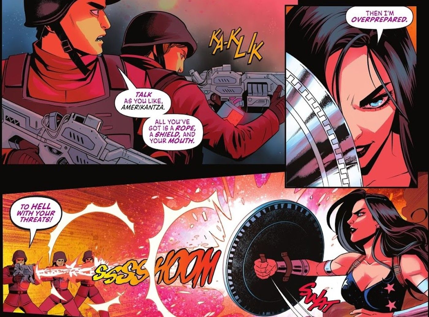 - Donna estrena su escudo y su cámara estilo Capitán América en su lucha contra los campos de trabajo fascistas en Markovia, usándolos para liberar a los prisioneros y exponer la verdad.