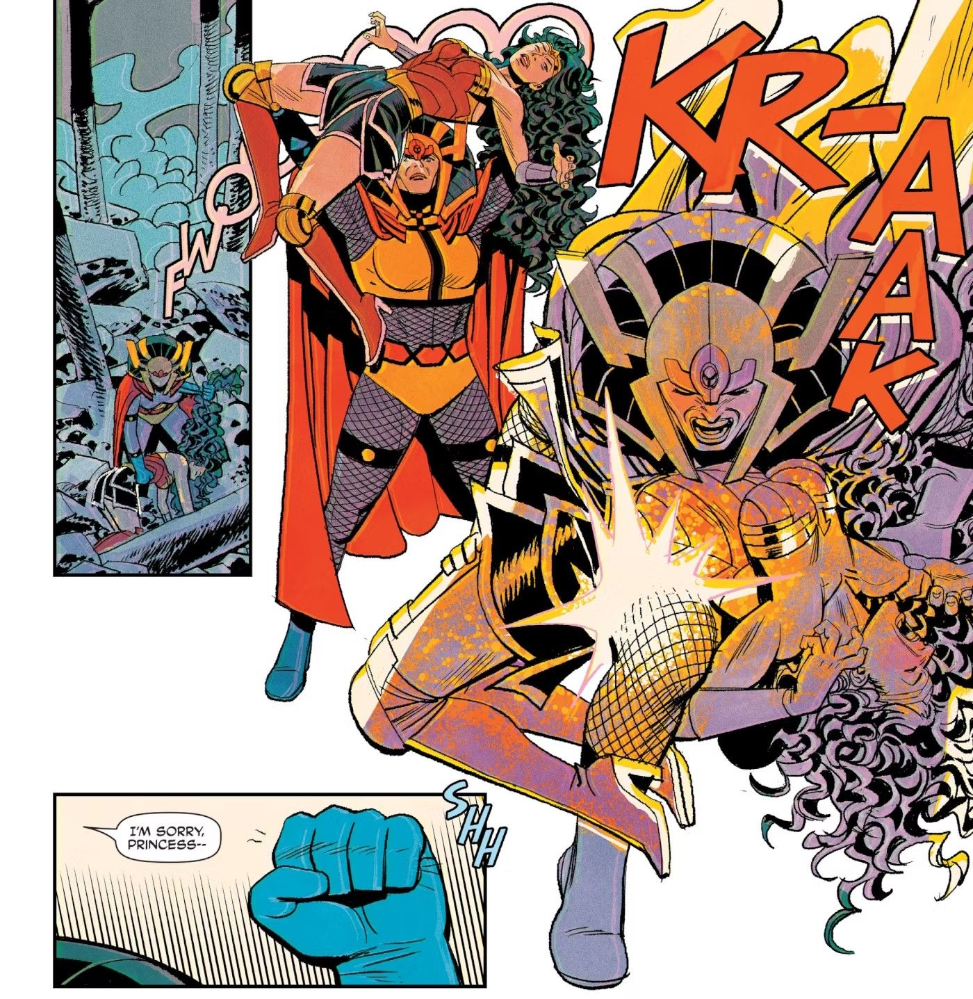 - Wonder Woman es atacada por Big Barda, quien casi le rompe la espalda en un movimiento que recuerda al icónico movimiento de Batman. Caida de caballeros.