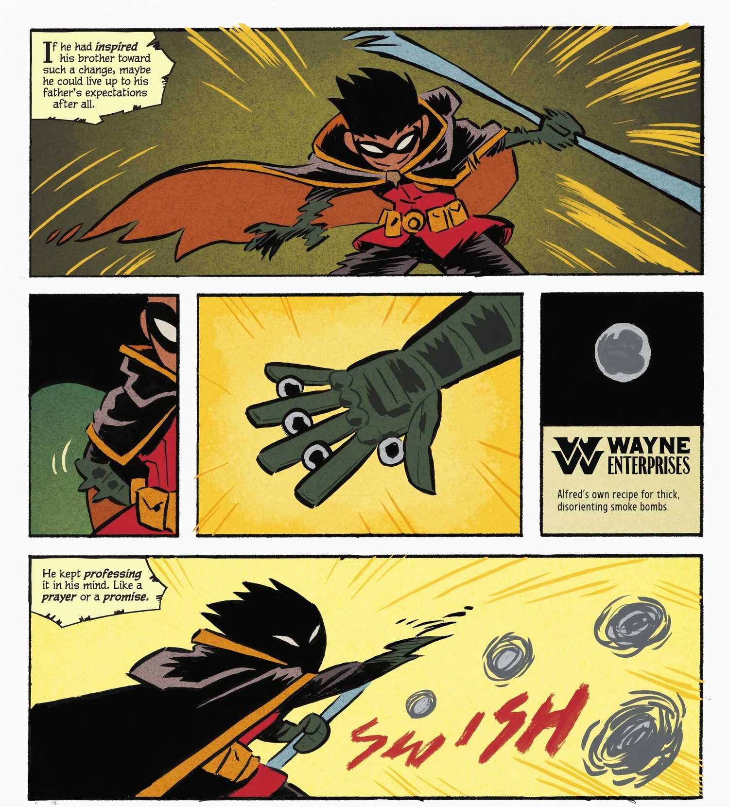Hay mucho que analizar en esta escena. En primer lugar, es absolutamente desgarrador que Damian sienta que constantemente no está cumpliendo con las expectativas de su padre. El mantra de Damian, “Seré digno”, lo que agrava aún más el asunto al mostrar cuánto desea ser bueno y el hecho de que no se siente digno. En tercer lugar, es desgarrador cuando, durante la pelea, Damian descubre que, después de todo, él no fue quien inspiró a Tim a hacer el bien; su hermano había planeado ayudarlo desde el principio. Por lo tanto, Esta revelación destruye la pizca de autoestima y logro que Damian había comenzado a sentir..