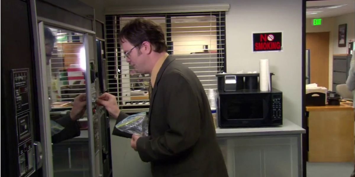 En el episodio "Booze Cruise", Dwight está asombrado cuando ve sus artículos personales a la venta en la máquina expendedora. Todo, desde la etiqueta con el nombre de su escritorio hasta su cabezón, estaba en esta máquina expendedora. Pero lo que era más preocupante era que su billetera estaba adentro. Estoy seguro de que Jim podría haberlo sacado fácilmente, pero jugar con el dinero de alguien nunca es una idea inteligente.