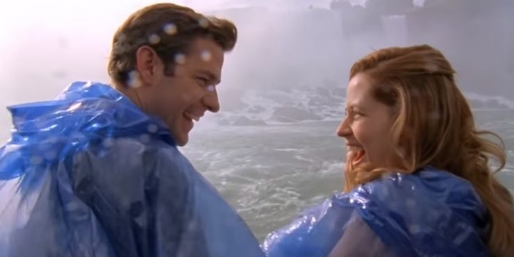 El día de su boda, Pam y Jim escapan a un bote en las Cataratas del Niágara y tienen una hermosa ceremonia con el capitán, nuevamente sin los padres de Pam allí. Pam declaró anteriormente en el episodio que estaba harta de todas las personas en su boda y quería que el día fuera sobre ella y Jim, pero casarse en un barco sin sus padres parece ir en contra de la caracterización anterior de Pam.