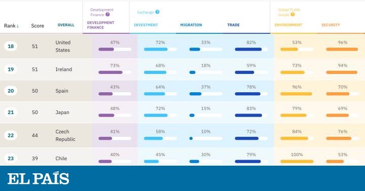 Europa lidera las políticas globales de desarrollo, con Suecia a la cabeza de seis de los siete indicadores del índice. En conjunto, la UE y el Reino Unido copan nueve de los diez primeros puestos, y dejan muy lejos a EE. UU. (puesto 18).Entre los países del grupo de ‘ingreso medio’ –en el que caen nueve de los miembros del G20–, Sudáfrica está a la cabeza, impulsada por su buen comportamiento en el área de la tecnología. Turquía le sigue, en este caso gracias a su generosidad en la recepción de refugiados. China es un caso aparte, como explicamos abajo en el despiece.Los países ricos de Oriente Medio recogidos en el índice golpean muy por debajo de sus capacidades económicas y tecnológicas. Emiratos Árabes Unidos, Arabia Saudí e Israel están al final de la lista, hundidos por el impacto de sus políticas energéticas y armamentísticas, además de su injerencia en los conflictos regionales.El informe de este año incluye una separata dedicada a la contribución de los 40 países a la salud global. La lógica es siempre la misma: ir más allá de la ayuda. En concreto, analiza las contribuciones a la seguridad en la salud global, la financiación de organismos internacionales, la investigación y la política comercial. Suecia vuelve a aparecer en cabeza, aunque en este paquete de indicadores aparecen también campeones improbables como Nueva Zelanda (apertura comercial), Sudáfrica (colaboración con países de ingreso bajo en investigación) o Turquía (esfuerzo en la financiación de la salud global).¿Y España? Nuestro país está en un modestísimo puesto 20 de la lista, ocho por debajo del ranquin de hace dos años. Suspendemos en tecnología, migraciones y ayuda, y nos va algo mejor en inversiones, comercio y seguridad. Solo en medioambiente destacamos con un 96%, el tercero en este ranquin por detrás de Chile y Francia. Cuando se ajustan los datos de acuerdo con la renta del país –y, por lo tanto, a su peso relativo dentro del conjunto– España asciende al puesto número 15 del escalafón. De hecho, el gráfico adjunto muestra cómo España es uno de los países que se sitúan ligeramente por encima del eje de “comportamiento esperado” de acuerdo con su capacidad económica.