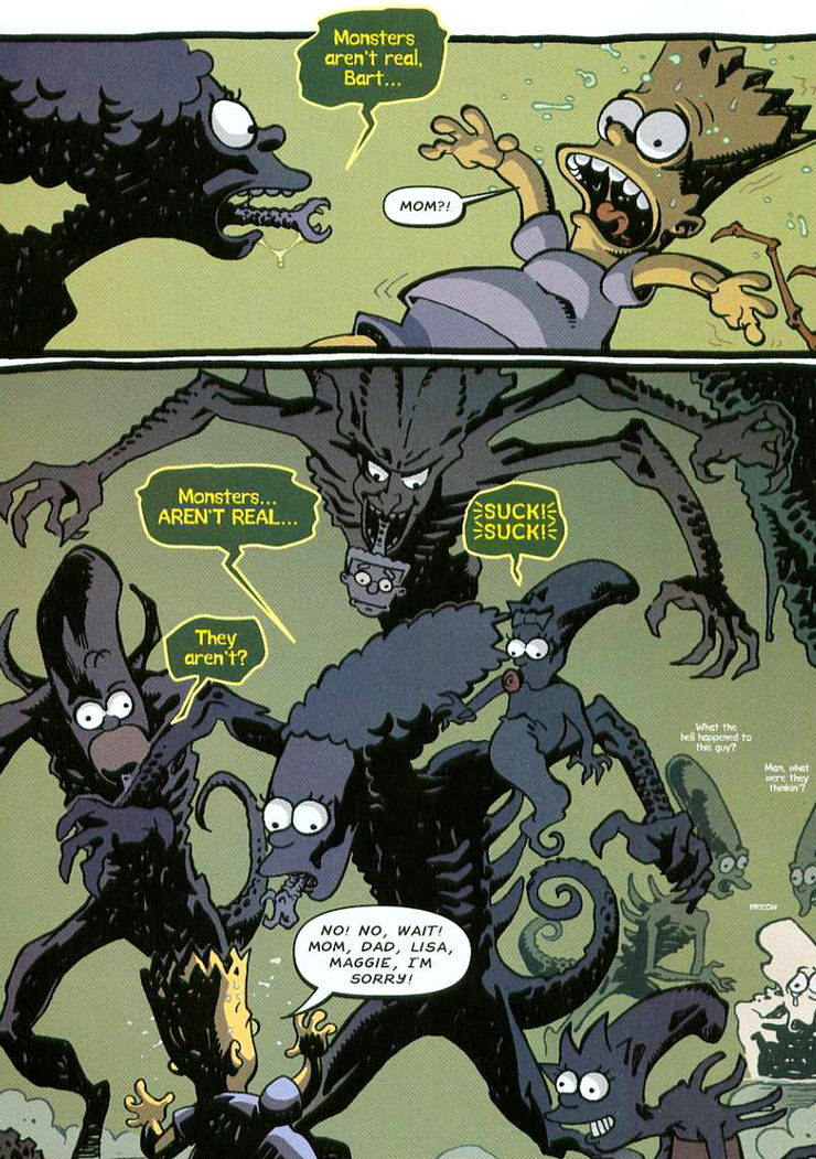 En La casa del árbol del terror de Bart Simpson #7de ‘En Springfield nadie puede oírte gritar’ – de Garth Ennis, John McCrea, Dave Stewart y Karen Bates – Bart está viendo un Picazón y picazón episodio que parodia Extraterrestre. El episodio lo asusta y se hunde en su subconsciente. Esa noche, Bart sueña que toda su familia, junto con algunos otros clientes habituales de Springfield, han sido capturados y embarazados por xenomorfos. Cuando los alienígenas finalmente brotan de sus cofres, demuestran una habilidad Xenomorph originalmente pensada para la película.