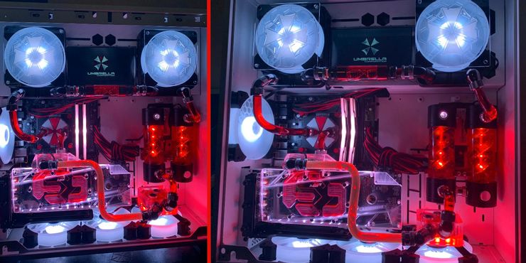 Inspirado por el Residente demoníaco franquicia, el usuario de Reddit 1YardLoss ha publicado fotos de su PC personalizada con el tema de Umbrella en el Residente demoníaco subreddit. Su PC tiene la insignia de Umbrella Corporation en sus ventiladores, así como en otras partes de la computadora, y presenta los colores rojo y azul del logotipo. Además, los depósitos que contienen el refrigerante para la PC son virales del virus T resplandecientes, lo que agrega un huevo de Pascua adicional para otros fanáticos. En los comentarios, 1YardLoss menciona que fabrican PC a medida en función de la comisión a través de su sitio web, OdderTech, en caso de que alguien esté interesado en una versión de PC similar.