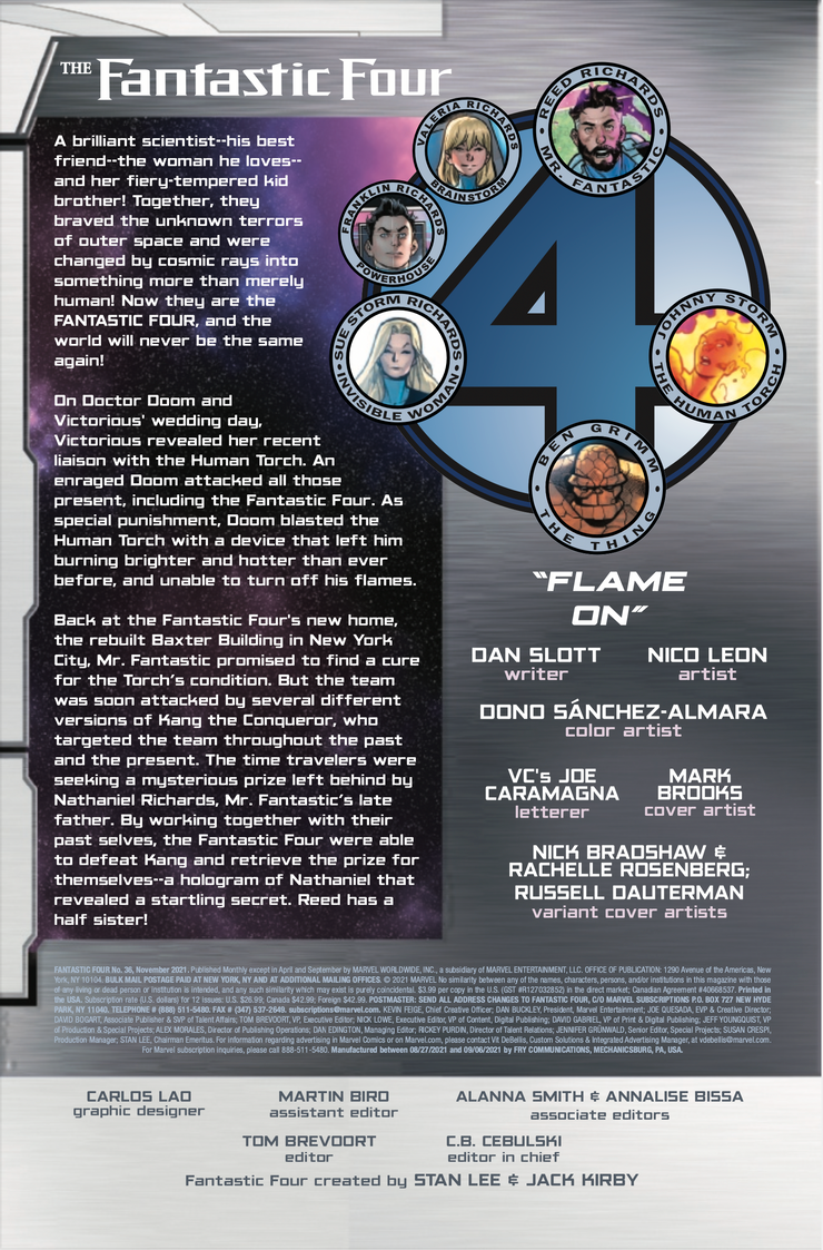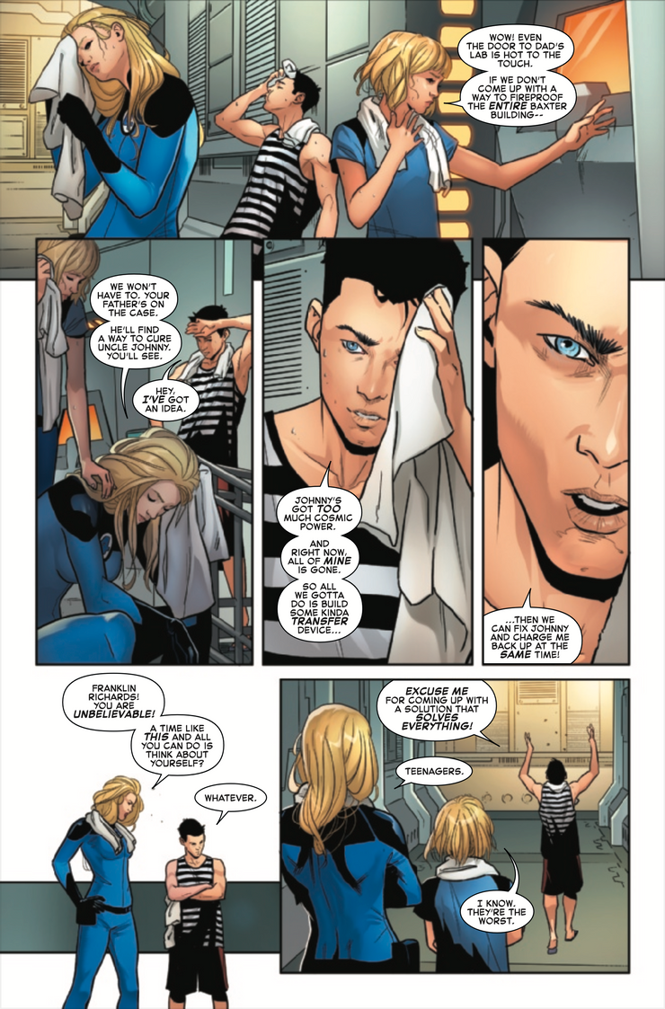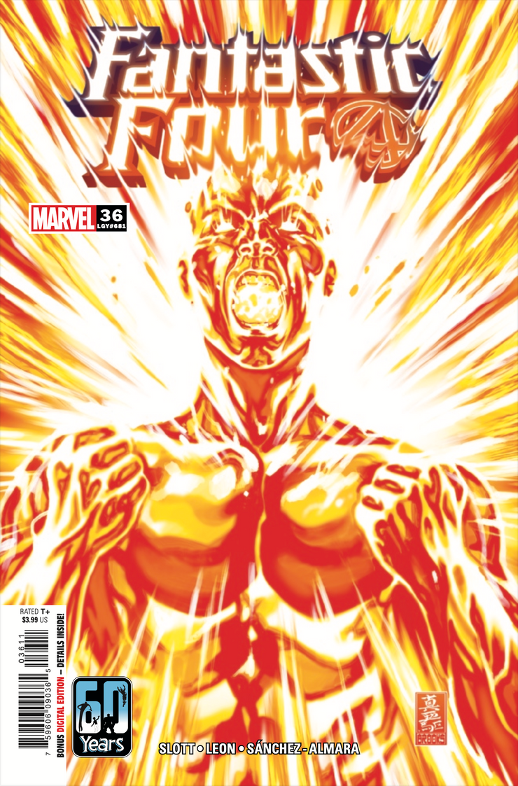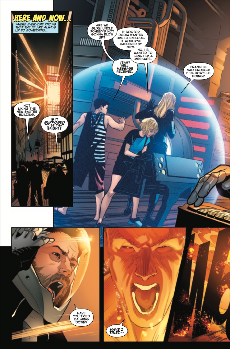 Vista previa de las páginas de las próximas Los Cuatro Fantásticos # 36 han sido lanzados por Marvel, mostrando las secuelas de la maldición del Doctor Doom. Johnny se está calentando incontrolablemente y Reed no puede detener el proceso. Mister Fantastic solo puede conjeturar “El efecto podría estar relacionado con su estado emocional. ¿Ha intentado calmarse?” La Antorcha Humana responde rotundamente de forma negativa. Sabe con qué frecuencia Reed ha intentado “curar” la Cosa y con qué frecuencia esos intentos han fracasado.