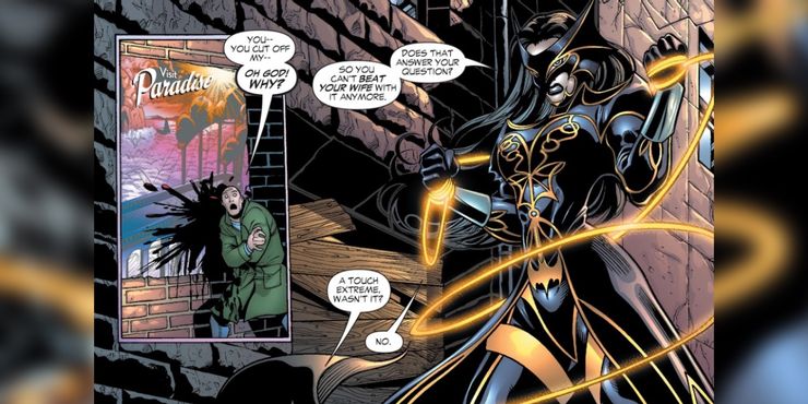 Vista ataviada con una armadura negra y dorada junto con una máscara facial con forma de murciélago, Batwoman de Diana blande su confiable Lazo de la Verdad mientras corta brutalmente el brazo de un criminal para que, según ella, no pueda golpear a su esposa con más Obligando al notoriamente violento Batman a gritar su brutalidad cuando dice: “Un toque extremo, ¿no?” Diana responde con un “No” sucinto e indiferente, lo que demuestra que esta personalidad de Diana no está dispuesta a jugar con la escoria de Gotham City.