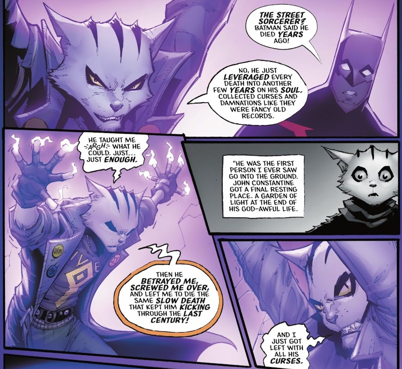 Batman del más allá El viaje al laberinto debajo de Gotham Deep da un giro mágico cuando finalmente se revela el pasado de Kyle the Catboi. El compañero de viaje de Terry McGinnis ha mantenido su vida en secreto desde el comienzo de su viaje, pero una confrontación con una cáscara de la Corte de los Búhos saca la verdad a la superficie. Kyle no aprendió la magia por casualidad; Fue entrenado y traicionado por el maestro mago John Constantine y se adentró en las profundidades con Batman para encontrarlo.