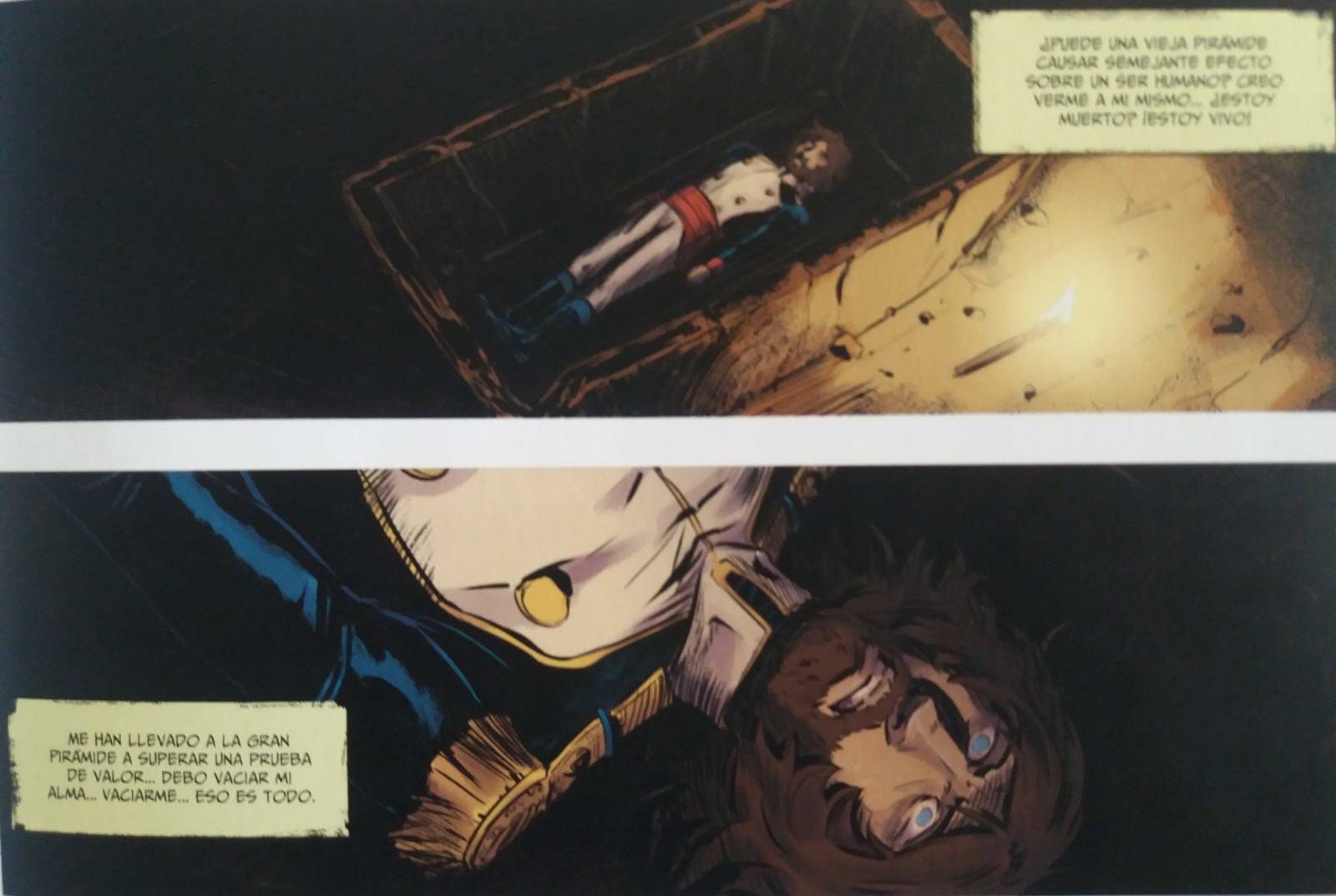 No todos los días ves a Napoleón metido en el sarcófago de la cámara del Rey en el corazón de la Gran Pirámide. Es una imagen que los muchos lectores de La pirámide inmortal, la popular novela de Javier Sierra que recrea desde la ficción la histórica pernoctación del general durante la conquista de Egipto, han tenido que representarse mentalmente, pero que desde ahora tiene materialización en el espectacular tramo central de la novela gráfica que con el mismo título han creado el guionista Salva Rubio y el dibujante Cesc Dalmases (con el color de Roger Surroca), y que publica Norma Editorial. Es la primera vez que una novela de Sierra se convierte en cómic.