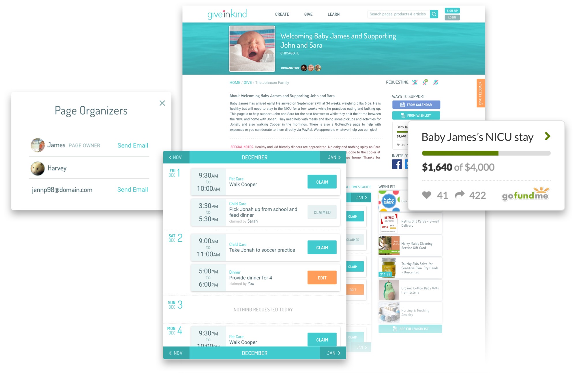 La idea con Give InKind es proporcionar una variedad de opciones para ayudar a alguien. Por supuesto, puede donar dinero en efectivo, pero también puede comprar artículos específicos de listas de deseos, coordinar entregas, configurar regalos recurrentes (como pañales o cajas de regalos) u organizar la ayuda en persona en un calendario incorporado.