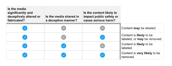 Por ejemplo, los medios manipulados “pueden estar” etiquetados, el contenido manipulado y engañoso es “probable que esté” etiquetado. El contenido manipulado, engañoso y dañino es “muy probable” que se elimine. Este tipo de redacción le da margen de maniobra a Twitter para hacer excepciones de política, sin realmente rotura política como lo haría si usara un lenguaje más fuerte como “será eliminado” o “será etiquetado”.