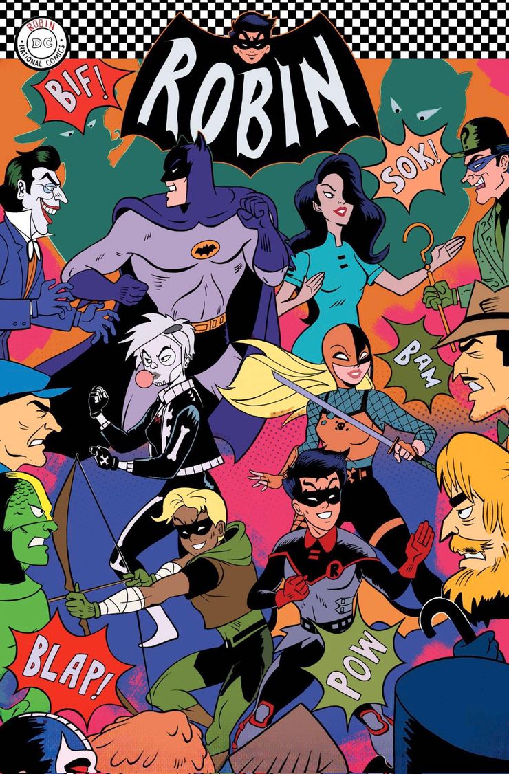 El próximo número de Petirrojo #16 contará con una portada variante de “Robin ’66” ilustrada por Dan Schoening. En homenaje a la serie, la portada muestra a Batman y su hijo Damian Wayne formando equipo con Ravagar, Talia al Ghul, Conner Hawke y Flatline contra una variedad de enemigos, incluido el texto de efectos de sonido para representar sus golpes. La variante muestra una colección de matones, junto con el Guasón y el Acertijo con sus trajes retro. Bane, Clayface y Penguin aparecen para hacer breves cameos en la parte inferior de la portada. Cada personaje evoca la era pasada, con el traje de asesino de Damian ahora apareciendo en el estilo de animación del tema. Del mismo modo, el disfraz de Batman parece idéntico al de la serie de los años 60. En lugar del logotipo reconocible al instante, el nombre de Robin aparece como título con su rostro en lugar de Batman. Incluso el logotipo de DC Comics ha sido reemplazado por una referencia a cuando el editor también se consideraba en gran medida como National Comics, a pesar de su énfasis en “DC”.