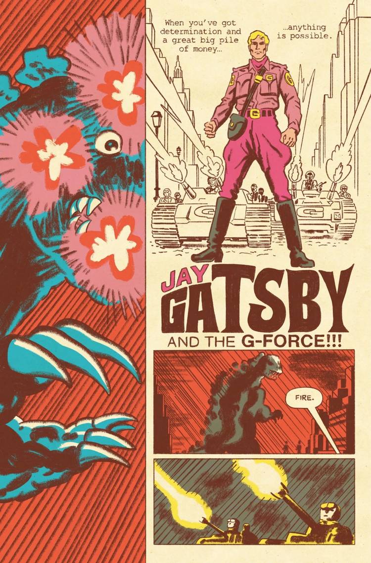 Teatro Monsterpiece de Godzilla sitúa la Gran G en la década de 1920, donde se encuentra con el rico Jay Gatsby. Los mundos de Ishiro Honda y F. Scott Fitzgerald se combinan en la más improbable de las mezclas de géneros, como Gatsby pronto solicita la ayuda de Sherlock Holmes, Julio Verne, Drácula y otros para hacer frente a la amenaza radiactiva.. La nueva serie de Tom Scioli, que se publicará en tres números de 48 páginas, publicó recientemente su primer número a finales de octubre.