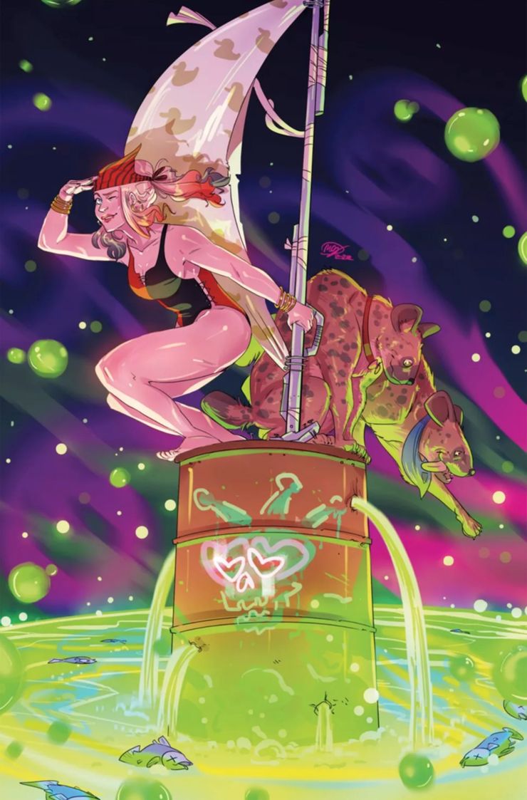 DC Comics reveló un puñado de nuevas portadas variantes de trajes de baño protagonizadas por héroes y villanos, que aparecerán en las portadas a lo largo de agosto. La portada de Harley Quinn de Megan Huang que aparecerá en Harley quinn #21 se burla del origen del héroe, ya que se la puede ver pirateando un barril lleno de agujeros con sus hienas sobre un mar lleno de ácido. En este caso, Harley parece tener el control de su destino, incluso si su elección de embarcación se filtra en el peor momento posible. La imagen captura la batalla personal de Harley al elegir un nuevo camino, mientras se mantiene a flote a pesar de una fuga en el barco.