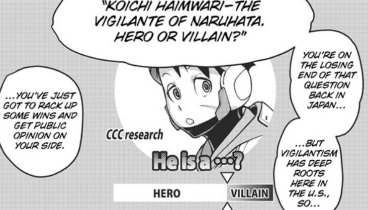 Como implica el título de la serie, Vigilantes se trata de héroes no registrados, o justicieros, que luchan contra el crimen ilegalmente, colocándolos en algún lugar entre héroes respetuosos de la ley y villanos que infringen la ley. Algunos, como Stendhal (que pronto será Hero Killer Stain), terminan convirtiéndose en villanos. También hay héroes, como el Capitán Celebrity, que no violaron las leyes pero llevaron a cabo algunas acciones moralmente cuestionables que causaron problemas en sus carreras. Ahora, los capítulos finales de Vigilantes han demostrado que lo contrario también es posible, permitiendo que el protagonista Koichi Haimawari pase de vigilante a verdadero héroe.
