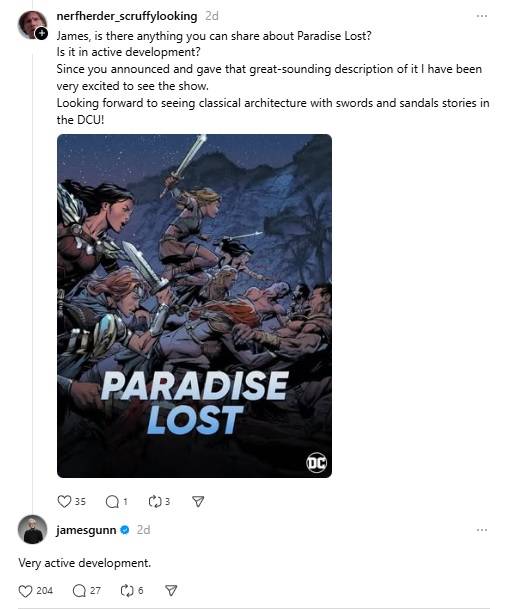 Como el primer programa de televisión del universo DC, Comandos de criaturasse estrenará en diciembre, Recientemente a Gunn fue preguntado en hilos por un fanático si había algo que pudiera burlarse del Paraíso perdido Serie que también está en desarrollo para el Capítulo 1: “Dioses y monstruos”. Si bien no ofrece ningún nombre en creatividades adjuntas, Gunn explicó que Paraíso perdido todavía se está trabajando, afirmar que el proyecto está en “Desarrollo muy activo“.