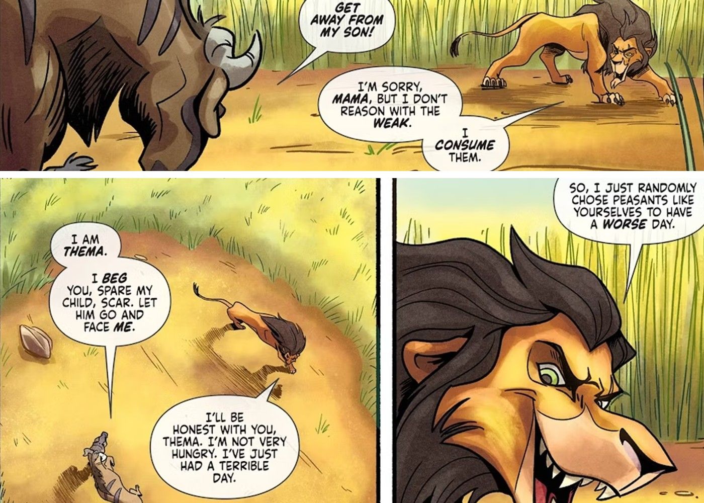 En la película original, la gran mayoría de los animales de presa (a excepción de Zazú, Timón y Pumba) son retratados como menos inteligentes que sus depredadores. Los leones tienen rostros exagerados y expresivos, pero las cebras, los antílopes y las jirafas están dibujados de una manera más natural, al menos en la primera película, y especialmente durante El circulo de la vida. Esto ayuda a minimizar la implicación de que cuando los leones matan y comen, están apuntando a seres que comparten sus intelectos de nivel humano. Sin embargo, Villanos de Disney: Cicatriz #1 lleva a casa que este es definitivamente el caso, ya que el joven ñu llama a su madre, quien luego ruega por la vida de su hijo.
