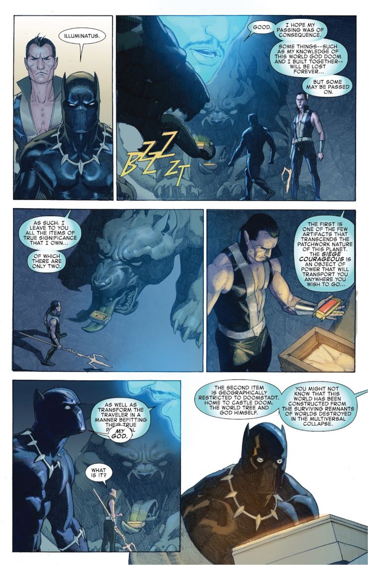 Finalmente se revela que Battleworld fue construido por Dr. Doom, Dr. Strange y Molecule Man. Doom finalmente mata a Strange, pero el Hechicero Supremo regresa como una aparición fantasmal a sus compañeros miembros Illuminati, Namor y Black Panther. En Guerras secretas #5, Doctor Strange les regala Siege Courageous, un talismán que permite la teletransportación. Strange continúa explicando que Siege Courageous “transformar al viajero de una manera acorde con su verdadera p[UNCLEAR]Alabama.Black Panther lo interrumpió al ver una versión del Infinity Gauntlet en la colección de Strange, por lo que la última palabra se oscurece, pero parece probable que lo que Strange iba a decir fuera “potencial.” Namor y Black Panther continúan usando Siege Courageous, pero ninguno parece experimentar cambios inmediatos de manera significativa. Crucialmente, al final de la historia, Panther usa el Guantelete para viajar en el tiempo, lo que lo convierte en uno de los pocos personajes que sigue siendo el mismo original cuando Franklin Richards remodela el multiverso a partir de los restos de Battleworld.