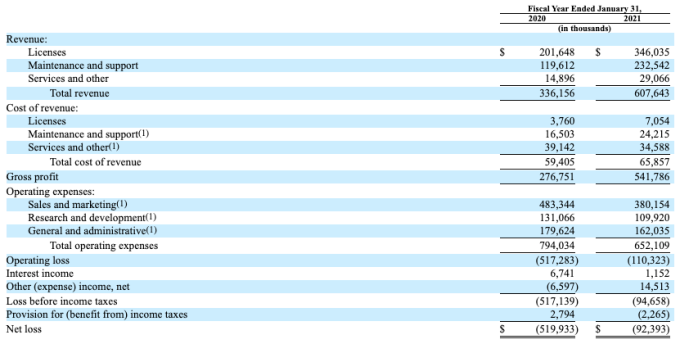 Para evitar forzarlo a cambiar entre la presentación y esta pieza, aquí está el estado de resultados de UiPath para sus años fiscales que se correlacionan aproximadamente con el calendario 2019 y el calendario 2020: