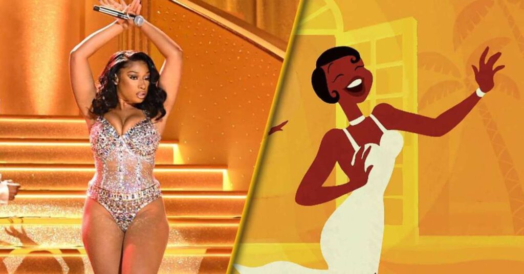 Megan thy Stallion y Cardi B presentaron WAP por primera vez en vivo en los Grammy, pero Princesa y el sapo los fanáticos obtuvieron un bono especial. Si bien gran parte de la conversación en torno a la actuación se centrará en su baile, hay varios homenajes directos a la película animada de Disney durante la misma. El maravilloso número musical de la princesa Tiana “I’m Almost There” tiene una animación al estilo del ilustrador de Harlem Renaissance, Aaron Douglas. Su trabajo de silueta característico todavía influye en muchos artistas de todo el mundo. Aparentemente, la rapera ganadora de un Grammy es una de ellas porque está vestida como la princesa de Disney cerca del comienzo de su etapa en el escenario. Megan realmente sacudió la casa también, con la artista masivamente popular aplastando su look y clavando esa rutina de baile.