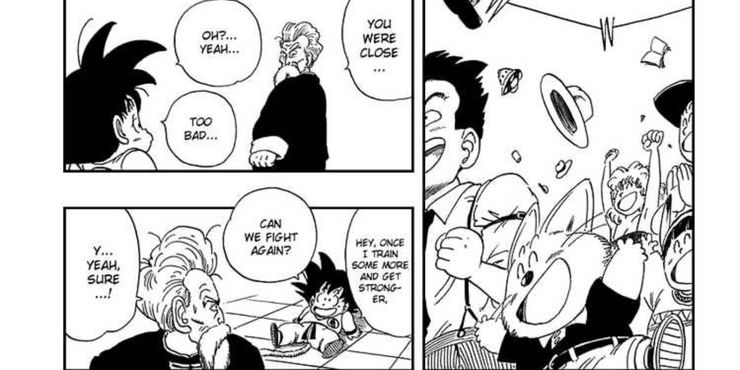 En esfera del dragón Capítulo 53 de Akira Toriyama, el Tenkaichi Budokai está llegando a su final culminante entre los dos últimos competidores, Goku y un Maestro Roshi disfrazado. La razón por la que Roshi usa un disfraz mientras lucha contra sus alumnos en el torneo es para enseñarles una última lección antes de que termine su entrenamiento con él: no importa qué tan fuertes se vuelvan, siempre habrá alguien aún más fuerte. Mientras Goku casi vence a Roshi, Roshi terminó saliendo adelante y ganó el Tenkaichi Budokai. Por lo tanto, su lección resonó en sus alumnos, especialmente en Goku.