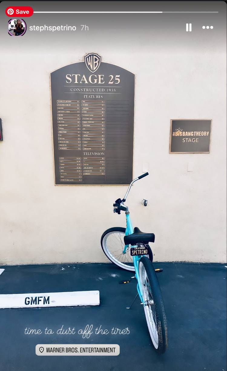 Spetrino muestra una imagen de La teoría del Big Bang escenario sonoro donde El primer matrimonio de Georgie y Mandy Será fusiladoTambién se han pintado las plazas de aparcamiento. “GMFM” designándolo como espacio del elenco y el equipo.