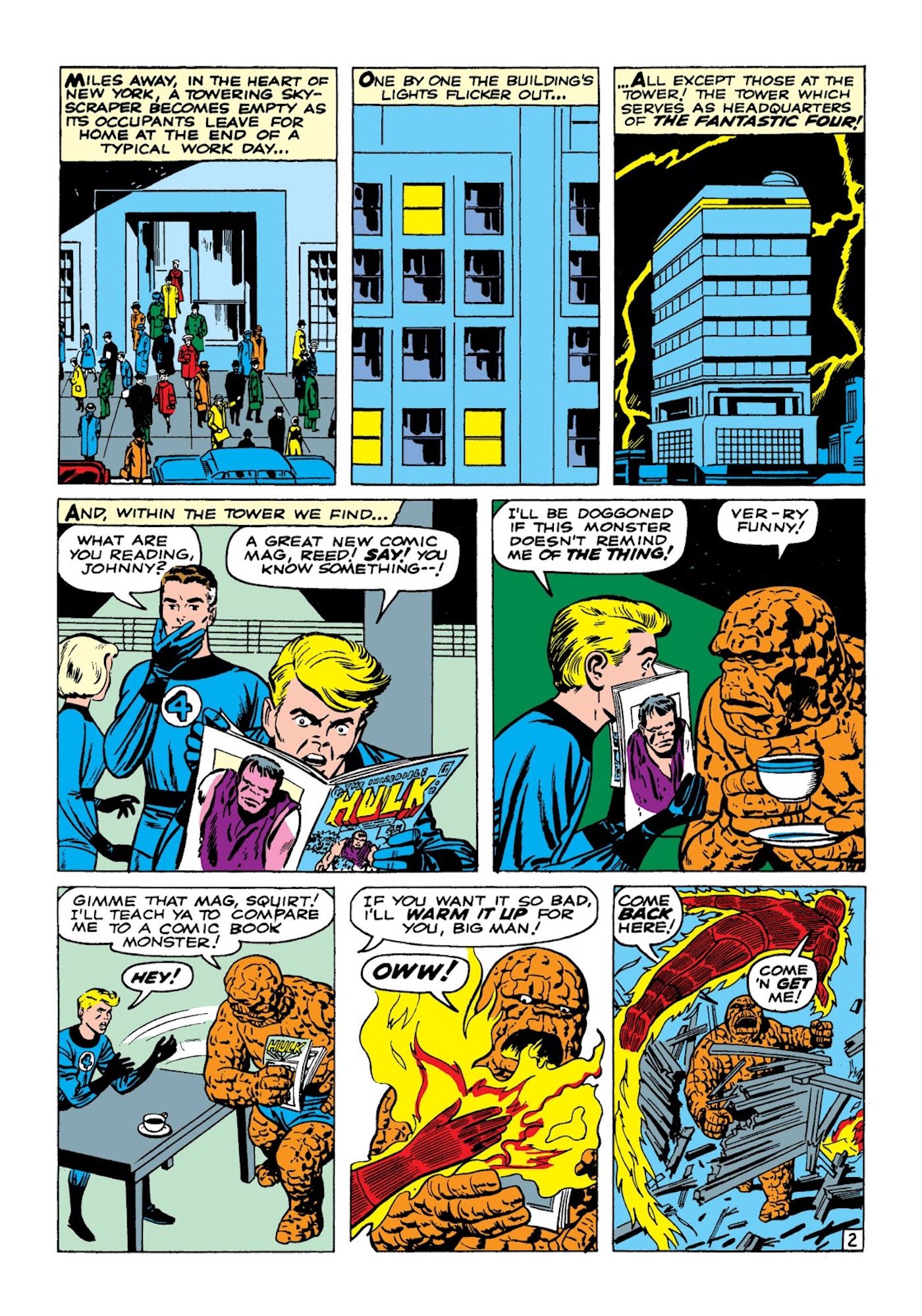 La historia, titulada “Prisoners of Doctor Doom”, comienza con los Cuatro Fantásticos en un raro momento de inactividad. Mister Fantastic y la Mujer Invisible están ocupados jugando mientras Human Torch lee un cómic. Mister Fantastic le pregunta al respecto, y Torch le dice que es “una gran nueva revista de cómics”. Curiosamente, la Antorcha Humana nunca lo llama “Hulk”. Los lectores ven entonces que es el primer número de El increíble Hulk. La Antorcha Humana luego dice que Hulk le recuerda mucho a la Cosa, un comentario que a la Cosa no le agrada. Arranca el cómic de las manos de Torch. Enojada, la Antorcha prende fuego al cómic y le dice a la Cosa “si tanto lo quieres, lo calentaré para ti, gran hombre”. Luego, Torch y Thing se pelean, lo que obliga a Reed y Sue a separarse.