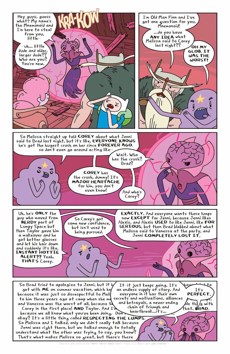 El arco cómico es una visión interesante de un posible futuro para Finn y los habitantes de Ooo antes de que el Viejo Finn y Bubblegum usen una versión actualizada de la máquina del tiempo de PB para viajar en el tiempo. Cuando Mnemonoid ataca la Casa del Árbol por primera vez, el Viejo Finn pone en marcha su plan, provocando un suministro interminable de chismes de LSP al preguntarle sobre el drama entre sus amigos Corey y Melissa. El talento de LSP para el chisme es la comida perfecta para el Mnemonoidequien se disculpa con Finn después de darse cuenta de que las historias de LSP son toda la comida que necesita para sobrevivir.
