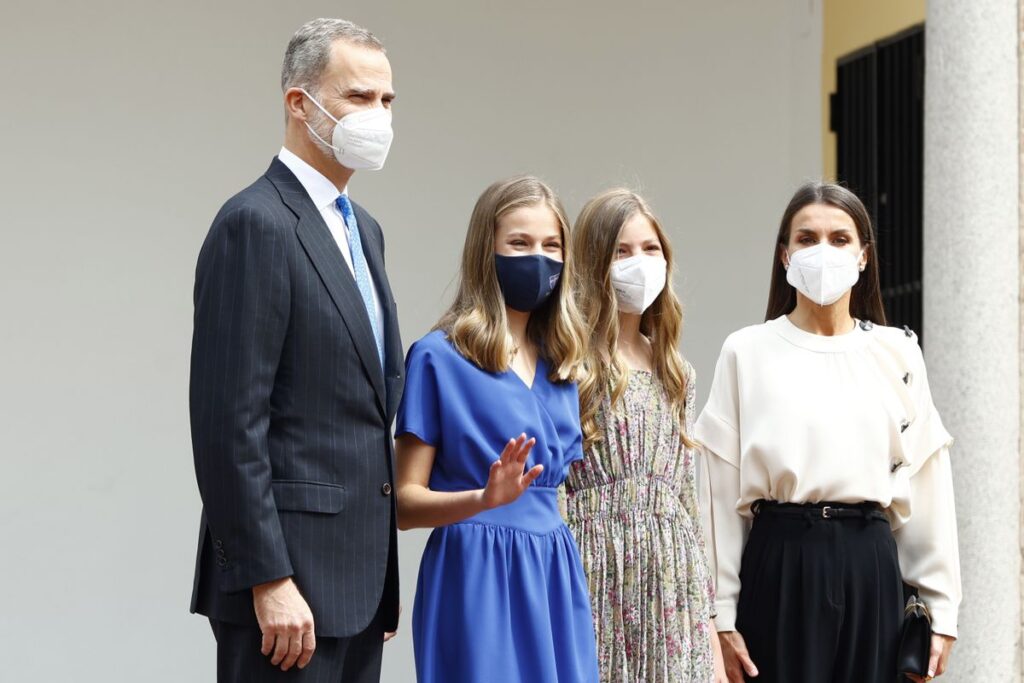 En esta iglesia de la Asunción también hizo la princesa la comunión el 20 de mayo de 2015, aunque entonces sí que estuvo acompañada por sus abuelos paternos y maternos. Entonces, además, vistió el uniforme del colegio, mientras que en esta ceremonia los confirmandos han podido llevar la ropa que decidieran; en este caso, Leonor ha llevado un vestido azul. Además, los 18 chicos —10 niños y ocho niñas— llevaban una mascarilla azul oscura con el escudo del colegio.