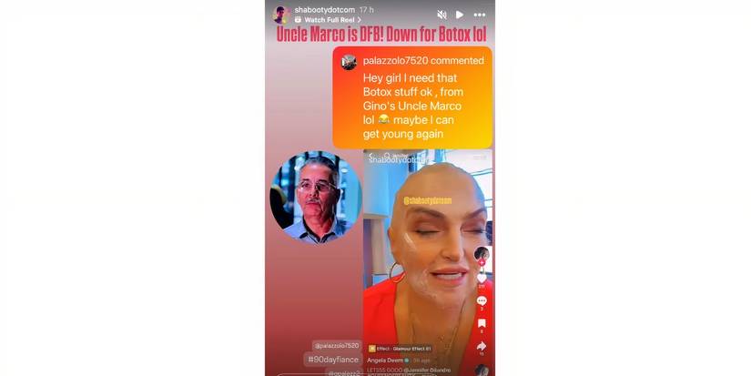 Shabooty Publicó una historia de Instagram donde el Prometido de 90 días Blogger trató de llamar la atención de los espectadores a un comentario. Shabooty había vuelto a publicar un video de Tiktok de Angela, donde estaba promocionando el negocio esteticista de su amiga. Uno de los comentarios que el blogger recibió en su video fue del tío de Gino Palazzolo, el tío Marco. El tío Marco fue quien caminó por Jasmine Pineda por el pasillo cuando se casó con Gino. El tío Marco comentó: “Hola chica, necesito esas cosas de Botox ok, del tío de Gino Marco lol Tal vez pueda volver a ser joven“En el video.