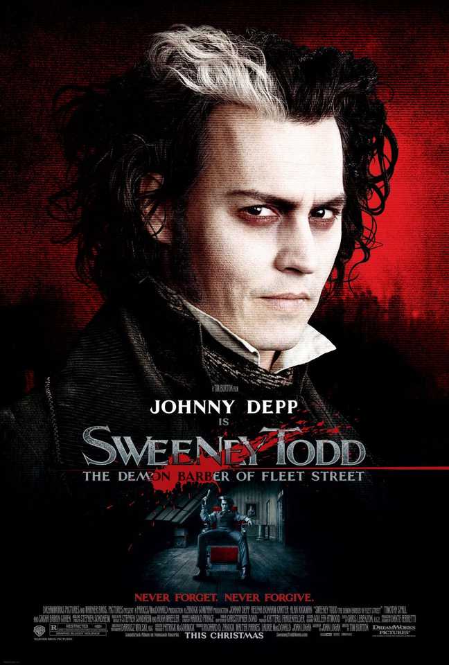 Sweeney ToddSweeney Todd de Tim Burton es una película de terror musical basada en la obra de teatro del mismo nombre. Johnny Depp interpreta al barbero que da nombre al film, quien se une a la panadera Nellie Lovett (Helena Bonham Carter) para buscar venganza contra quienes le hicieron daño. El elenco también incluye a Alan Rickman, Timothy Spall y Sacha Baron Cohen.