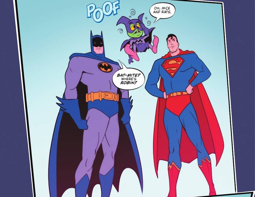 Súper amigos se considera parte de la Edad del Bronce de DC, por lo que este dúo posterior a la crisis no recordará los trajes icónicos que de repente usan en la Segunda Dimensión. El traje de murciélago azul y gris y el calzoncillo rojo de Superman son similares a los estilos en Lo mejor del mundopero mientras Bat-Mite descubre cómo volver a inflar a los héroes, Batman y Superman son brevemente sus personajes de dibujos animados de los sábados por la mañana de los años 70. Mientras tanto, en el Salón de la Justicia, en la Tercera Dimensión, Mxyzptlk está ayudando a Robin y Jimmy Olsen con el ataque de los villanos plagados de ácaros.