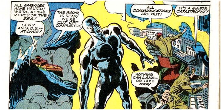 El punto fue mejor enfatizado en 1968 Surfista de plata #3, por Stan Lee y John Buscema. El cómic comenzó con Silver Surfer visitando a una mujer en el hospital, con la intención de curarla con el Poder Cósmico; la policía se opuso a él, pero él actuó de todos modos, salvándola con lo que describió como un “rayo cósmico.En respuesta, un oficial de policía abrió fuego contra Silver Surfer, quien se protegió antes de irse. Luego, en una escalada dramática y sin precedentes, Silver Surfer decidió darle una lección a la humanidad. Lanzó una serie envolvente de ráfagas cósmicas a través de el globo; parecían actuar de la misma manera que un pulso electromagnético, haciendo que todas las máquinas fallaran. Los generadores de energía se apagaron, y el mundo quedó sumido en la oscuridad. Los aeropuertos se cerraron, y los controladores de tráfico no pudieron comunicarse con el ahora- aviones impotentes en los cielos. En Rusia, un cohete Sputnick no se pudo lanzar. En el espacio, un astronauta miró hacia abajo al mundo, sus comunicaciones se cortaron repentinamente y miró conmocionado los pulsos de energía cósmica que podía ver barrer el planeta. .