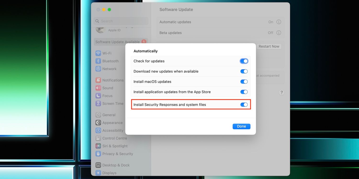 Para desactivar las Respuestas rápidas de seguridad en una Mac, haga clic en el icono de Apple en la barra de menú en la parte superior de la pantalla. Haga clic en ‘Ajustes del sistema‘ E ir a ‘General.’ Seleccionar ‘Actualización de software‘ y haga clic en la ‘i’ junto a ‘Actualizaciones automáticas.’ Desactive la palanca junto a ‘Instalar respuestas de seguridad y archivos del sistema.’ Es posible que los usuarios necesiten ingresar su contraseña o huella digital para realizar el cambio. Grifo ‘Hecho‘ y las Respuestas rápidas de seguridad se desactivarán. Para volver a activarlos, vaya al mismo menú y active el interruptor. Manzana dice que para aplicar una Respuesta de Seguridad Rápida, una Mac debe estar conectada a la corriente o tener un porcentaje mínimo de batería del 10 por ciento (Apple Silicon Macs) o del 20 por ciento (Macs basadas en Intel).