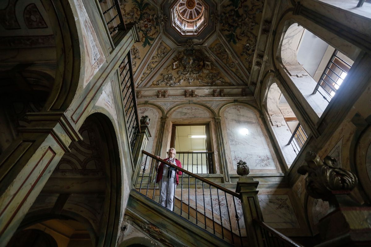 Una escalera volada de madera de pino con acabados verdes y rojos, ahora desgastados por el tiempo. Las grietas en la pared y en los peldaños, de 14 centímetros de grosor, dejan al descubierto su estructura. La escalinata cuenta con arcos de medio punto y tres arcos escarpados. En el suelo, antiguas baldosas azules y amarillas. Al alzar la vista, una cúpula plana en forma de pirámide que ilumina la sala con la luz del mediodía: “La mayoría de las cúpulas de Alcalá son cúpulas encamonadas”, asegura el historiador.