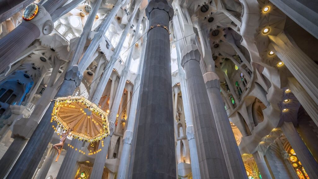 Cabe señalar que en el interior de la Sagrada Familia no hay ni una sola línea recta. Todo está construido imitando a la naturaleza como forma de enaltecer a Dios. El interior recrea un bosque con columnas arborescentes que invitan a los files a la oración.