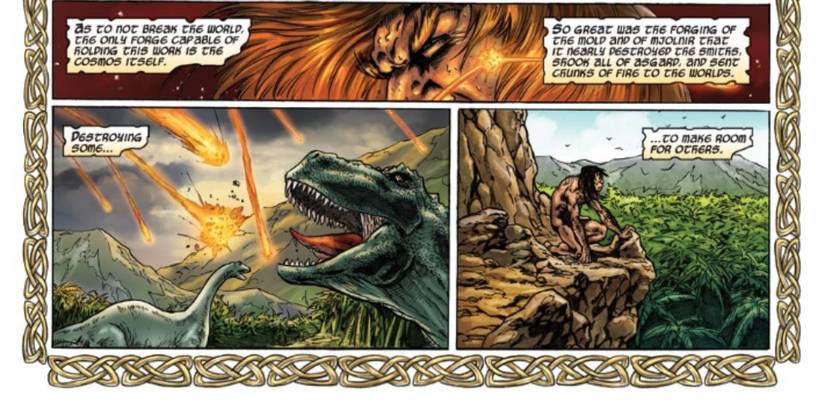 En Mighty Thor #12 Por Jason Aaron y Russell Dauterman, se muestra a los lectores cómo la creación de Mjölnir mató a los dinosaurios. Alternativamente, Thor #19 por Donny Cates y Nic Klein sugiere que la colisión de dos titanes cósmicos fue lo suficientemente catastrófico como para causar ramificaciones en todo el universo, incluida la manifestación de un asteroide que golpeó incidentalmente a los dinosaurios. Si bien estas razones son muy diferentes de las sugeridas por el dragón, todas pueden coexistir. Uno puede imaginar que Marvel Los dragones consumían regularmente dinosaurios, y una creación de asteroides o martillos fueron los finales finales en su ataúd de los que los dinosaurios no podían volver.