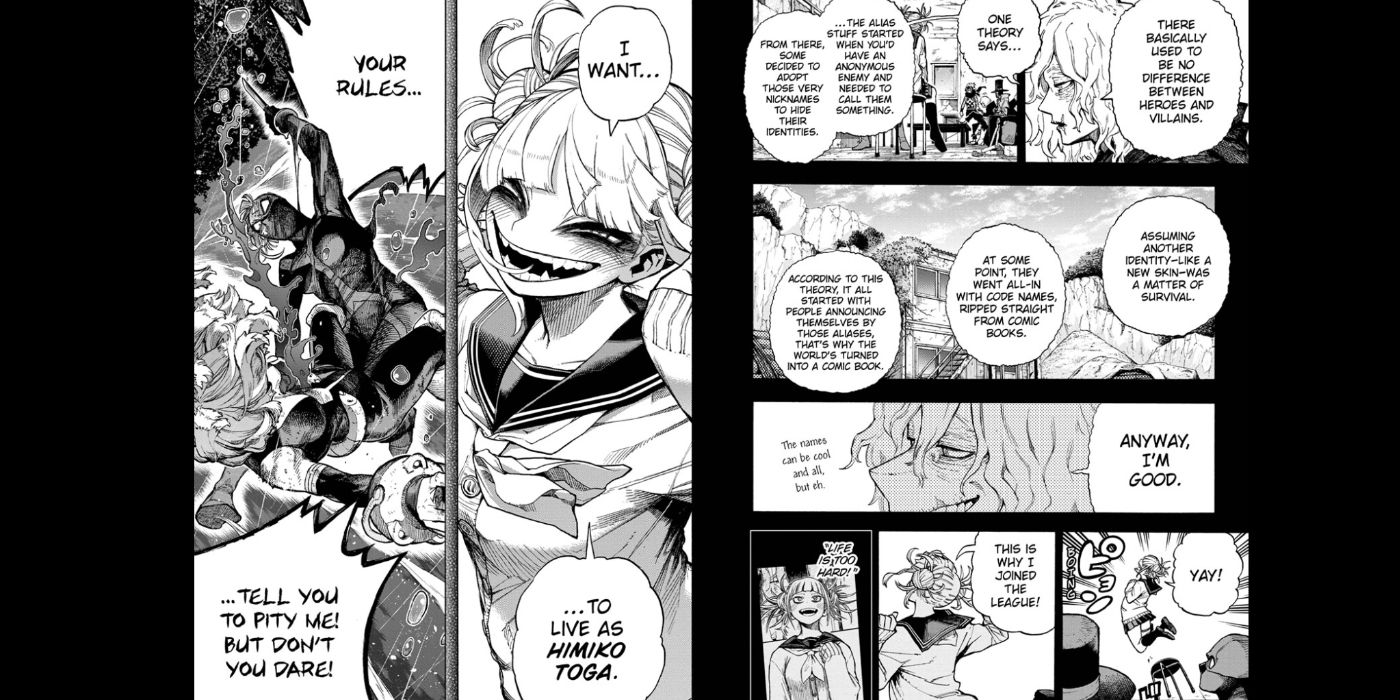 En mi héroe academia Capítulo 393, durante un flashback en el que los miembros de la ahora antigua Liga de Villanos intentan convencer a Himiko de que se le ocurra un nombre de villano como todos los demás, finalmente dice que quiere vivir como Himiko Toga. Su razonamiento se produce después de que Tomura Shigaraki probablemente defendiera su posición al divulgar la teoría de por qué surgieron los nombres de héroe y villano. Al comienzo de la sociedad Quirk, no solía haber distinción entre héroes y villanos, por lo que todos comenzaron a usar nombres en clave simplemente para identificar a sus enemigos. Toga dice que rechaza esas reglas impuestas y solo quiere vivir como ella misma.