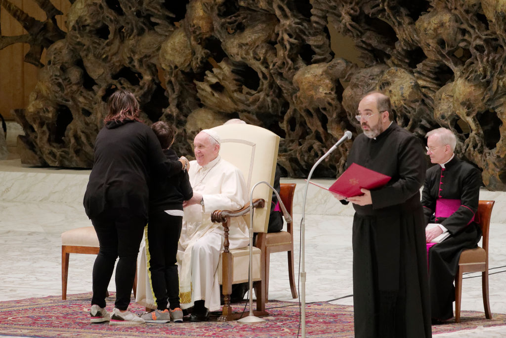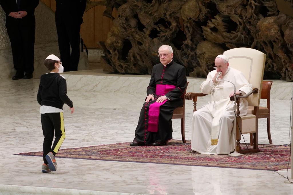 Un niño con discapacidad se convirtió en el protagonista de la audiencia general celebrada por el papa Francisco, al separarse de su madre, subir al estrado y pedir a toda costa el solideo del pontífice. (Foto de Massimo Valicchia/NurPhoto via Getty Images)
