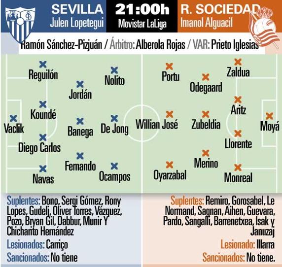 De momento, como ya hizo en la previa del Alavés, Imanol no quiere conceder ni un milímetro a su homólogo y paisano Lopetegui. Es hoy, día de partido, cuando el técnico ofrece la convocatoria y cuando el equipo se desplaza a Sevilla. De nuevo deberá hacer media docena de dolorosos descartes. Lo normal es que el entrenador vuelva a tirar de su ‘once’ fetiche, con puntales como Moyá, Zaldua y Zubeldia, ausentes el otro día, más los intocables Llorente, Monreal, Odegaard, Oyarzabal y compañía, pero todo es posible. El único ausente por lesión es Illarra, ya que hasta Willian José se ha recuperado de forma óptima del fuerte golpe en la nariz recibido el jueves.