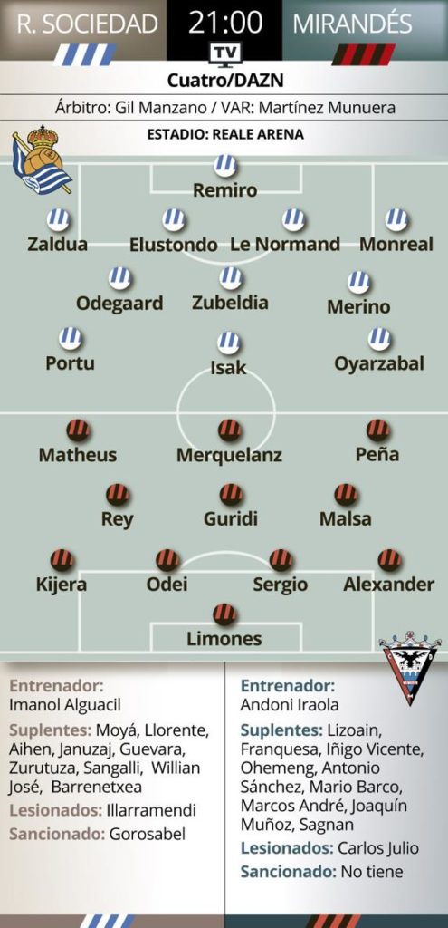 El Mirandés, con Guridi y Merquelanz, llega dispuesto a romper los planes de la Real. No ha caído lejos de Anduva desde el 7 de diciembre y, desde entonces, acumula 12 partidos sin perder, seis fuera de casa en los que ha marcado 18 goles. Tiene una plantilla corta pero, con una clara vocación ofensiva y un incuestionable talento atacante, su intención es volver ‘vivo’ a Miranda de Ebro.