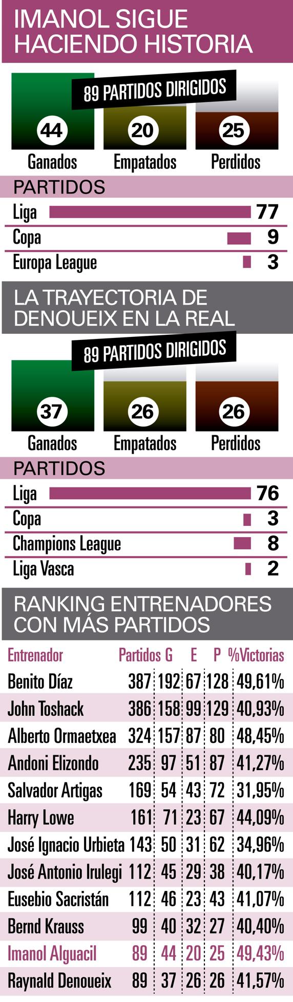Denoueix para llevar a la Real hasta la última jornada de la temporada con opciones de ganar el título, sólo el tiempo lo dirá. Lo que de momento puede esgrimir el entrenador de Orio es que no sólo resiste la comparativa personal con el técnico francés, sino que la mejora. Alguacil igualó derrotando al Granada los 89 partidos que dirigió Denoueix a la Real y su balance numérico es superior. Ha ganado siete partidos más que el francés y ha perdido uno menos lo que, a priori, le otorga los mismos argumentos estadísticos, cuanto menos, para creer que se puede aspirar a todo.
