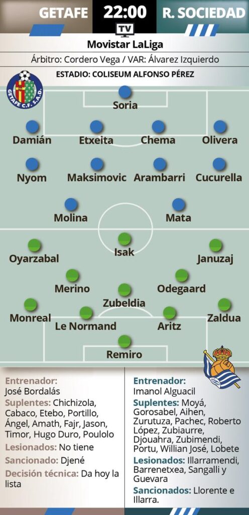 Cara a cara se colocarán los dos peores equipos de la parte alta de la tabla tras el parón de 91 días por el coronavirus. La Real llega con la pesada mochila de su racha más negativa con Imanol, tres derrotas seguidas, mientras que los azulones han empatado tres y perdido uno de sus cuatro duelos. Realmente llevan cinco sin alzarse con el triunfo. El confinamiento les sentó como un tiro a ambos. Las necesidades son evidentes. Tuvieron que parar en marzo batiéndose a bofetadas por el cuarto puesto, en plena pugna por la Champions, y dos semanas después esa aspiración parece el sueño de una noche de primavera. Claro que si el vencedor es el Getafe se colocará a dos puntos del Sevilla y si lo hace la Real, a cuatro.
