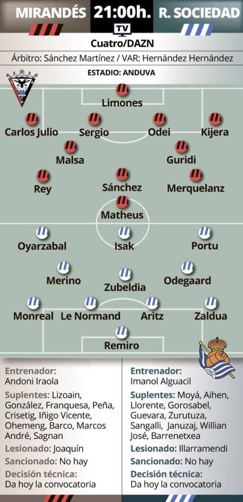 Imanol dispone por primera vez en muchos meses de casi toda su plantilla en condiciones -sólo Illarramendi no puede jugar hoy- por lo que cuenta con todas las herramientas para trazar el plan soñado. Todo lo que no sea repetir la alineación de la ida, con Portu por Januzaj respecto al equipo que ganó el viernes al Valladolid, sería una enorme sorpresa. Es decir, Remiro; Zaldua, Elustondo, Le Normand, Monreal; Zubeldia, Merino, Odegaard; Portu, Oyarzabal e Isak. Al banquillo optan diez futbolistas de los que Alguacil descartará hoy mismo a tres.