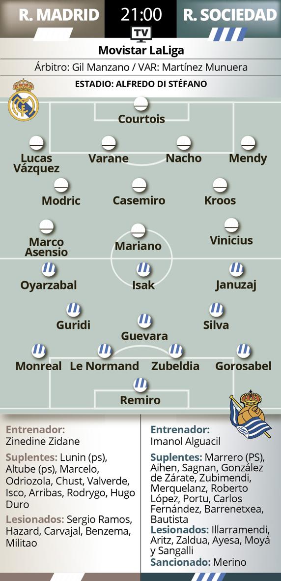 La Real Sociedad, por su parte llega a este duelo de Valdebebas sin Mikel Merino ni Asier Illarramendi. El equipo vasco suma tres victorias y un empate en los cuatro últimos partidos ligueros. O lo que es lo mismo, en un buen momento para volver a sorprender a los blancos, como ya hicieron en la pasada edición de la Copa del Rey en el Santiago Bernabéu. Ha sido uno de los escasos resultados positivos que han obtenido los vascos ante el equipo de Zidane, que se ha llevado 7 de los 10 enfrentamientos ante la Real Sociedad.